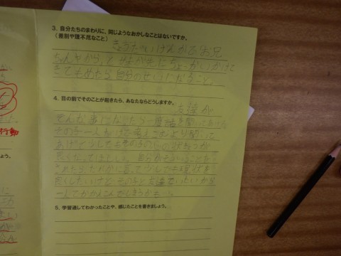 6年 身の回りにある差別や理不尽に感じられること,目の前でそのようなことが起きたらどうするかについて,各自の考えをワークシートに書いています。