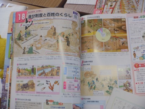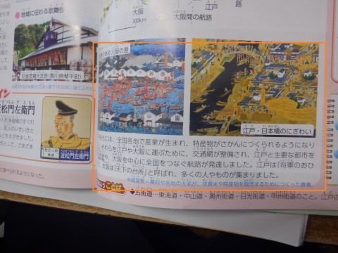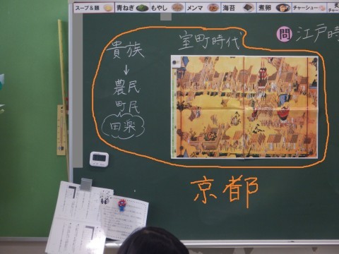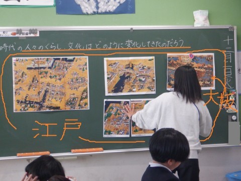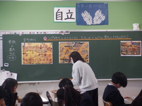 6年社会の学習です。江戸時代の政治の仕組みの学習に続いて,人々の暮らしや文化について調べています。平安時代には文化の担い手は貴族でしたが,室町時代になると,庶民の側からも文化が生まれるようになりました。またその中心は京都でしたが,江戸や大坂(大阪)も文化の中心になりました。