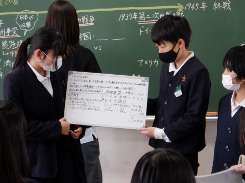 大きな問いのうち,この時間は大戦間の30年に何があったのか について追究したグループが発表しました。不景気や社会不安を打開するために満州を支配しようとした日本が,国際的に孤立していったことについて発表していました。