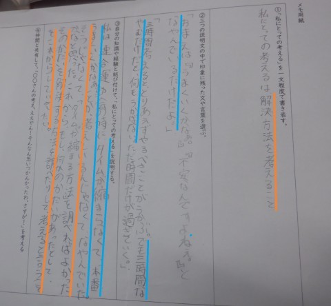 教材文の「3時間考えるととりあえずやるべきことが浮かぶ。でも3時間なやむだけだと,何も浮かばない。ただ時間だけが過ぎていく」という部分を,連合運動会の練習の時の自分の経験に重ね合わせて考えています。6年生ならではの学習が進んでいました。