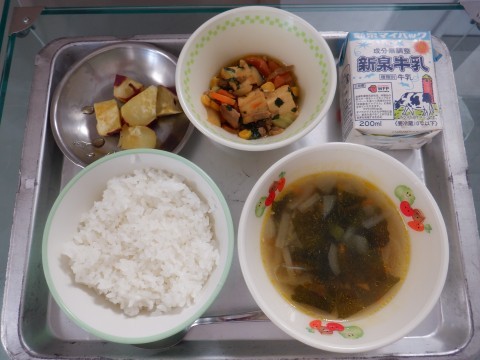 今日の給食は,ご飯・牛乳・わかめスープ・厚揚げの中華煮・焼きだいがくいもです。