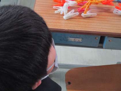 2年図工の学習です。洗濯ばさみを使った「立体アート」を作っています。