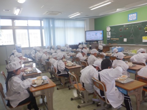 1年生の給食の様子です。今日のメニューはチキンライス、オムレツ、野菜スープでした。1・2組の様子です。
