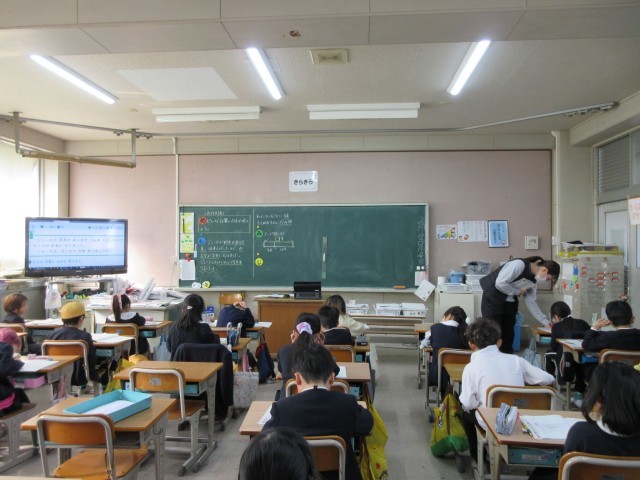 2組は算数。「どんな式になるか考えよう」□を使って考えます。