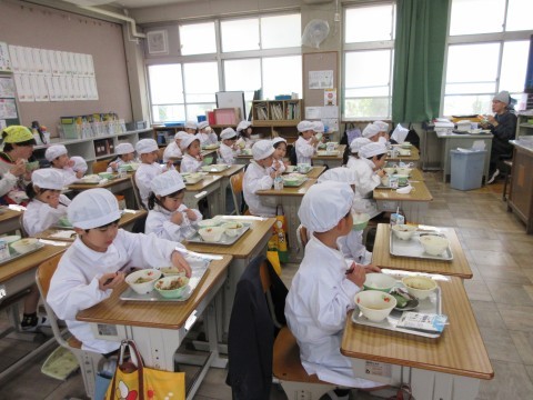 「牛乳・みそ汁・混ぜたらごはん・柏餅」です。小おかずを白ご飯に混ぜて混ぜご飯として食べます。柏餅のデザート付きです。柏餅にはみんなが元気に大きくなりますようにとの願いも込められているそうです🎏