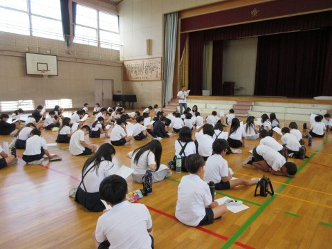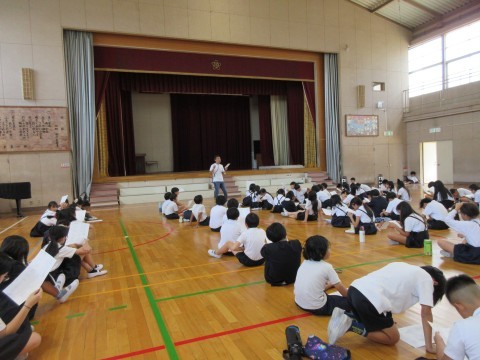 5年生が体育館で「臨海学校の説明会」を行いました。10月5・6日に向けていよいよ細かい動きや持ち物などの確認が始まりました!