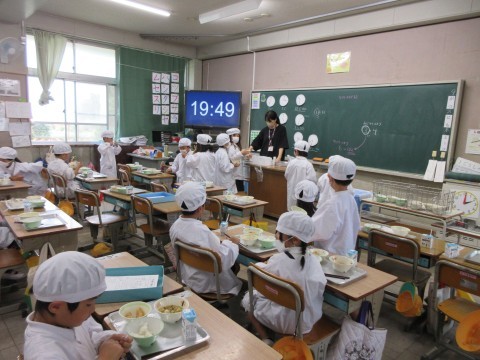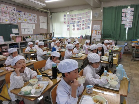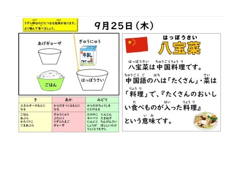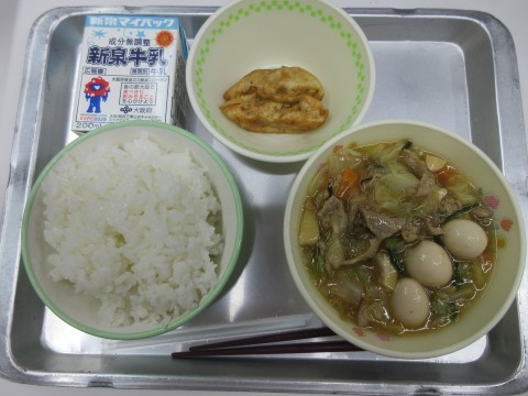 今日の給食はみんな大好き「八宝菜」と「揚げぎょうざ」です。1年生もご飯を大盛りお替りしていました🍚