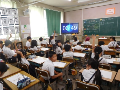 1組は社会です。堺市の良さについて班ごとにプレゼンテーションをしています。
