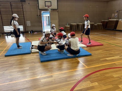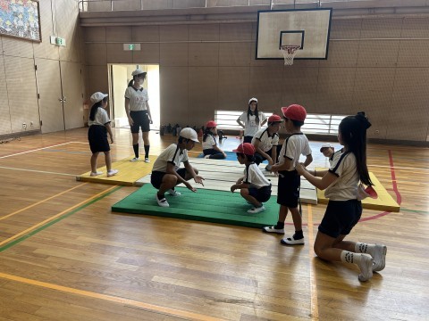 福田小学校恒例のすもう場所に向けて、体育館で、6年生が1年生にまわしの回し方や、そんきょの姿勢などを教えてあげていました。