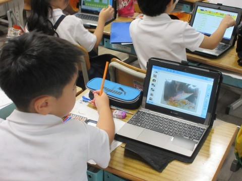 2組では,海のいきものについて調べていました。画面を見ると,先生も初めて見るおもしろい魚が!!いろんな色や形のいきものがいるんだね🐡
