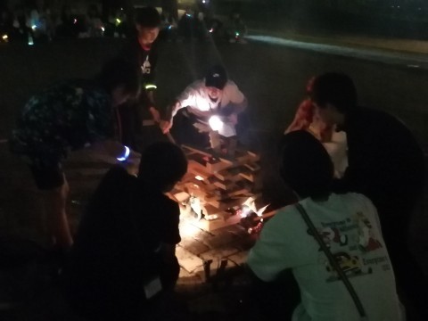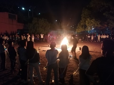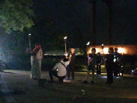 おいしいご飯を食べたら、いよいよキャンプファイヤーの始まりです!火の神様が現れ、火の子たちに火を分け与えてくださいました🔥さぁ楽しい時間の始まりです✨️