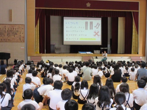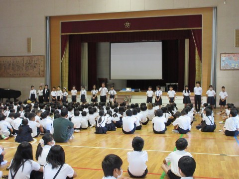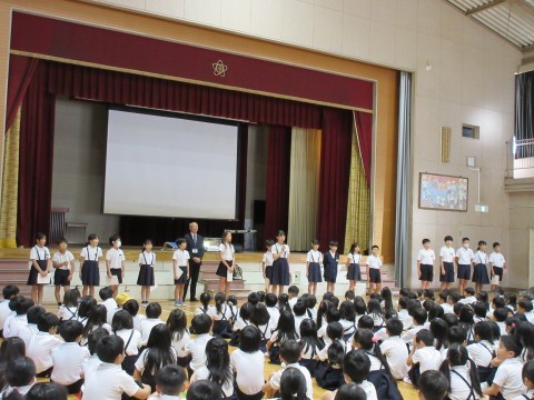 今週は5年生が臨海学校で不在だったため,今日,全校朝礼を行いました。