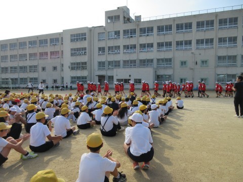 全校児童が運動場に集まり,6年生の連運の壮行会が行われました。