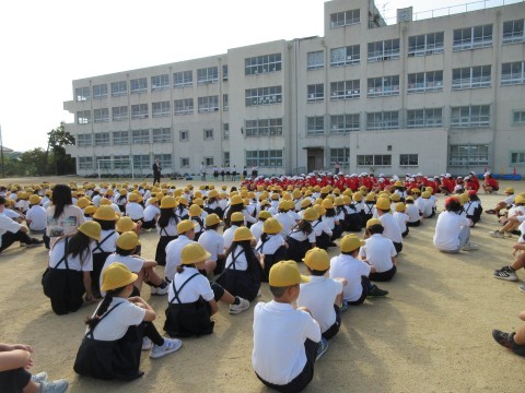 6年生を1~5年生が拍手で出迎え,校長先生のお話しを聞きました。