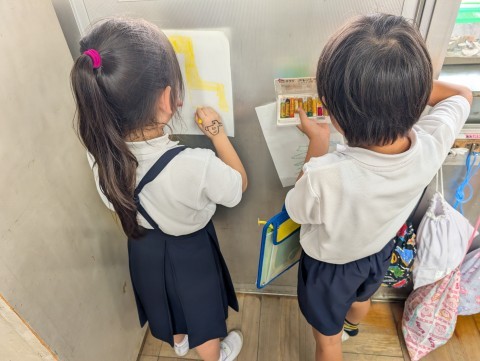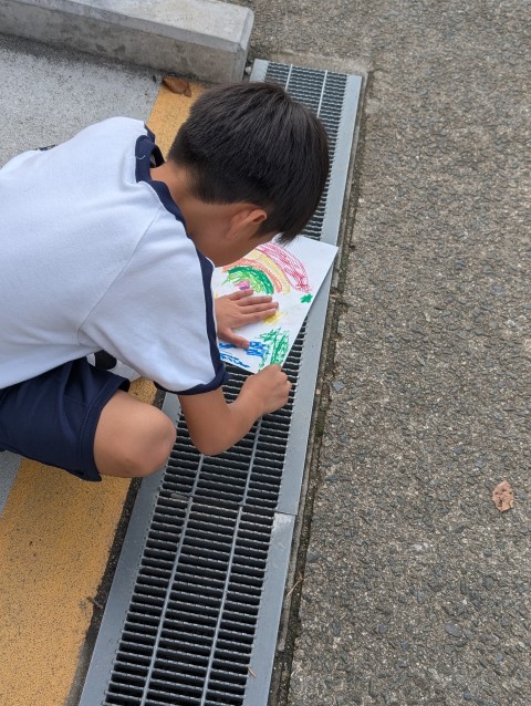 「こすりだしから うまれたよ」の学習をしました。でこぼこを見つけて,こすってみると,いろいろな模様が出てきました。教室にも,中庭にも,体育館前にも,たくさんのでこぼこがあったようです。「ここのでこぼこ,楽しそうやで」「きれいに,うつせたよ」と,まずはうつす楽しみを感じていました。重ねてみるのも,きれいでした。「図工って,楽しいな」と,感じてくれた時間にもなりました。