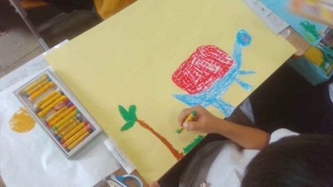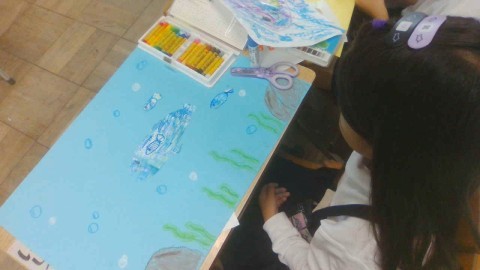 こすりだしたあとは,何に見えるかな?と考えながら,画用紙に描いていきました。「魚に見える」「恐竜にしていく!!」など,イメージをどんどん膨らませていました。みんなの絵がそれぞれ工夫があって,おもしろいです。あのこすりだしから,いろいろなものが見えてきたね!!