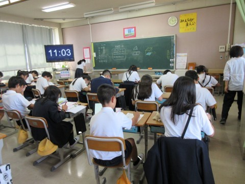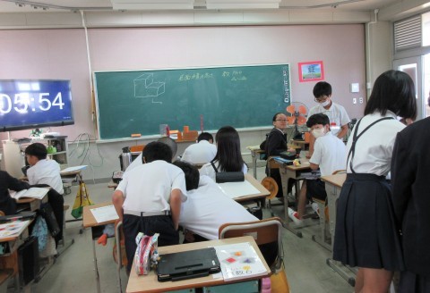 1組は、立体の面積を求めるプレテストに取り組んでいます。
