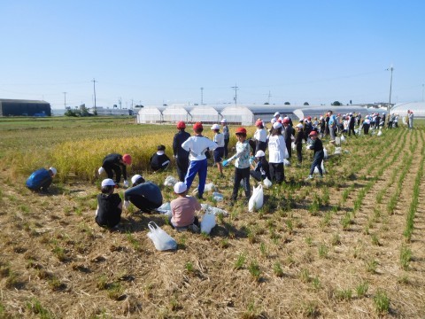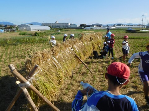 刈り取った米を束ねて天日干しをするなど,初めての作業で子どもたちも楽しみながら学んでいました。