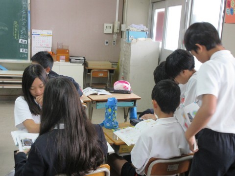 3組は外国語。生き物ポスターを作るために,それぞれの生き物の気持ちを想像していました。生き物たちの望んでいることはなんだろう?