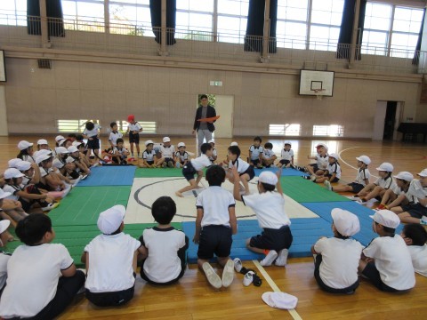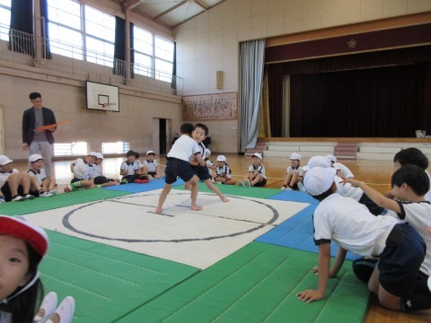 2年生が合同でおすもうをしていました!みんなの応援する声が体育館の外にも響いています。