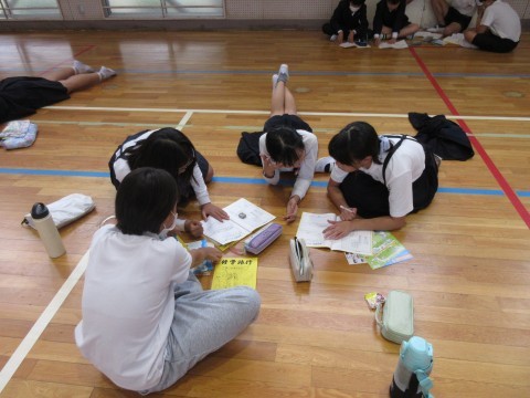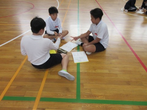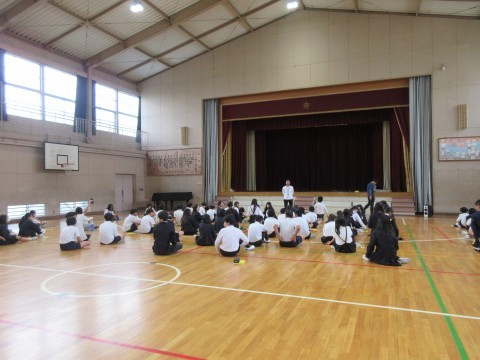 5時間目,6年生が体育館で修学旅行についての集会がありました。
