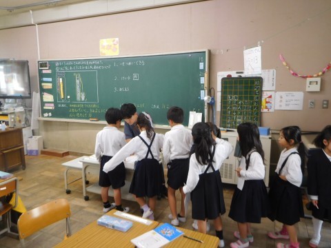 2組は算数です。足し算の文章問題に取り組んでいます。