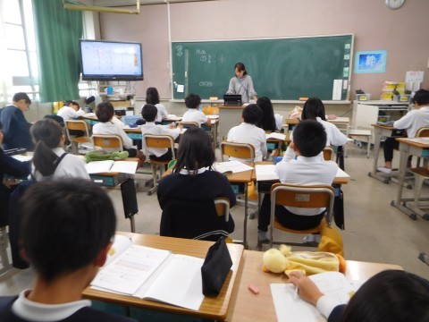 1組は算数です。「等しい分数」の練習問題にみんなで取り組んでいます。