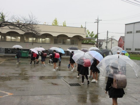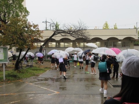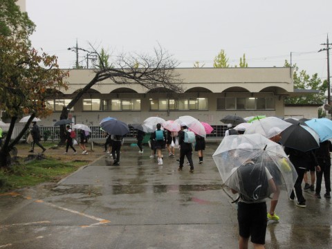 冷たい雨が降る中,6年生が「にんげん学習交流会」のために東陶器小学校へ向けて出発しました。