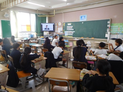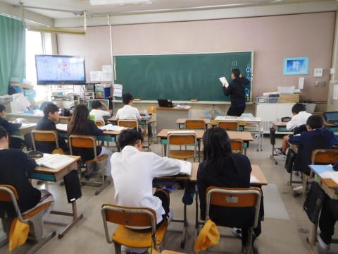 3組は家庭科です。企業に勤める人のインタビュー動画を見て、物の選び方を学習しています。