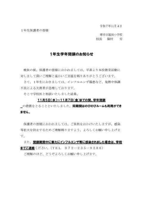 11/4 明日より3日間,1年生は学年閉鎖です!