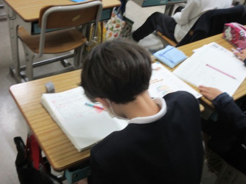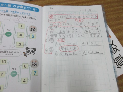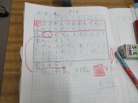 算数で,2の段の九九を使った問題にチャレンジしていました。色や記号,吹き出しを上手に使って,ノートに自分の考えを書くことができています!すごい✨