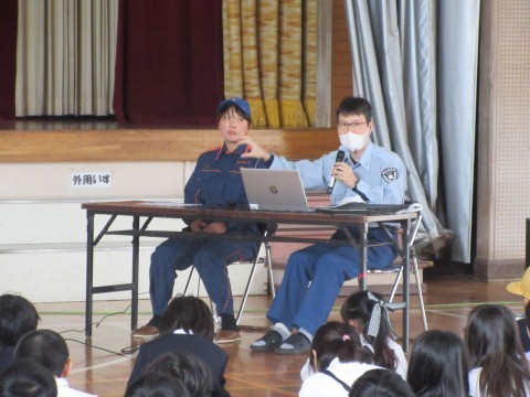 消防署の方が,出前授業に来てくださいました。火災が起きた時,煙を吸ったらどうなるのかな?もし寝ている時に地震が起きたらどうすればいいのかな?分かりやすく丁寧にお話をしてくださいました。子どもたちは真剣に話を聞き,一生懸命メモをとっていましたよ✐ 消防署のお仕事について,まだまだ知りたいことが出てきそうです✨