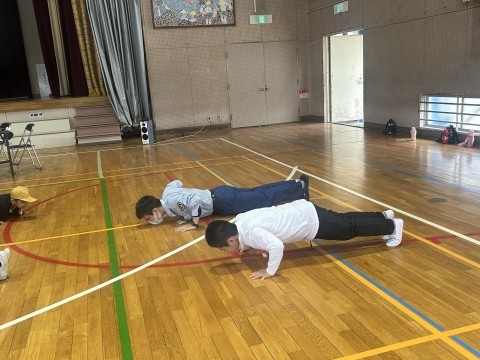 また日ごろのトレーニングについての話から,どのくらい体力があるのかという流れになり,腕立て伏せの勝負をさせていただくことに!!