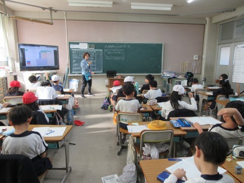 2組は算数。お菓子が5個入った箱が,1つ,2つ・・・5つになると,お菓子は全部で何個?かけ算を使って求められるかな?☺