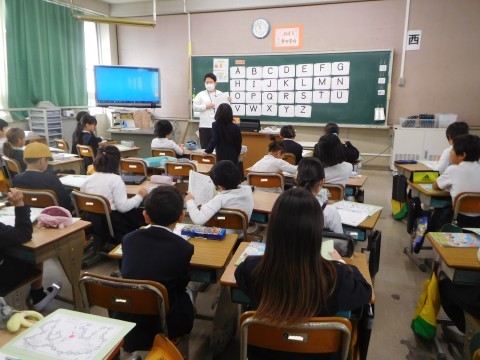 1組は外国語です。教室の中のアルファベットをみつける活動をしています。