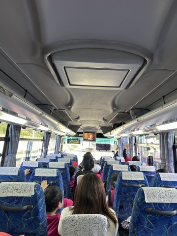 バスが出発しました。ミニオンを観ながら学校へ戻ります🚌