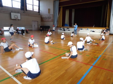 2組は体育です。なわとびの様々な技にチャレンジしています。