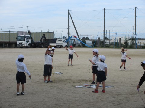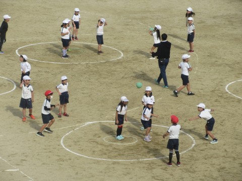 1組は体育。縄跳びの後は,お楽しみのサークルシュートゲームです!相手にとられないように,うまくシュートできるかな?🥎