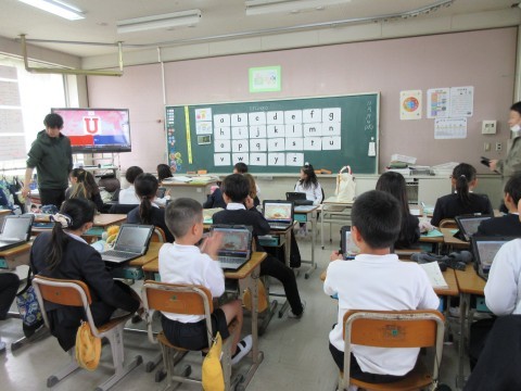 3組は外国語。小文字の練習です。楽しいゲーム感覚で学んでいます!