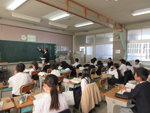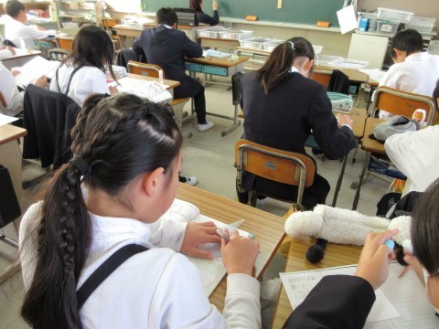 2組は算数。平行の線の書き方の学習。三角定規を使ってずれないように丁寧に線を引いていました。