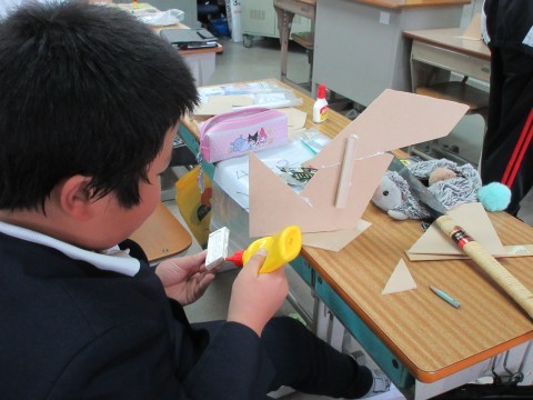 2組は図工。のこぎりで切った木の板を,縦横自由に組み立てていきます。1枚の木の板は,どんなものに変身するのかな?完成が楽しみです☺