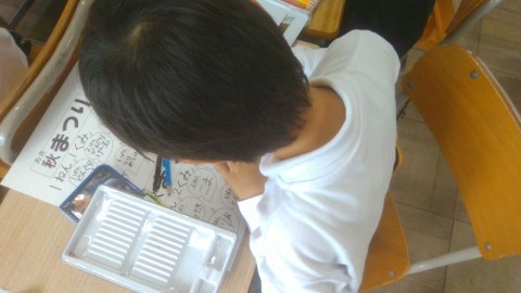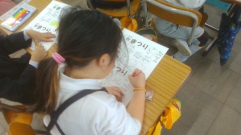 おもちゃ万博に参加させてもらったお返しに,次は水曜日に「秋まつり」に2年生を招待します。その招待状を作りました。2年生の素敵な招待状を参考に,もらって嬉しい招待状を作ることをめあてに頑張りました。たくさんのお店があるので,全部回ってもらえると嬉しいね!!色塗りも上手になってきたなと感心しました。2年生に喜んでもらえる「秋まつり」にしようね!!エイエイオー!!