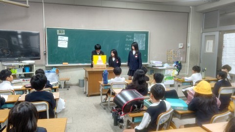 今日の朝、図書委員会のお兄さん、お姉さんが読み聞かせに来てくれました。