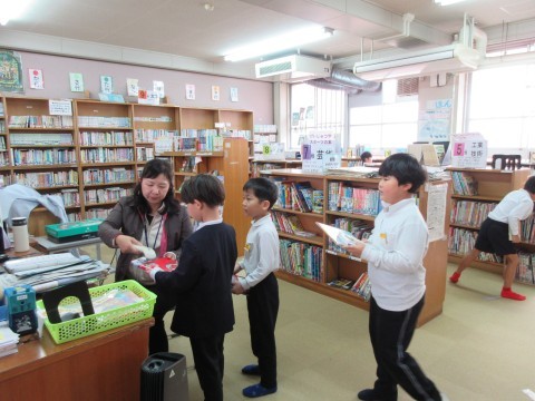 1組は図書の時間です。図書館司書の先生に貸し出しをしてもらっていました。