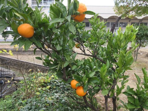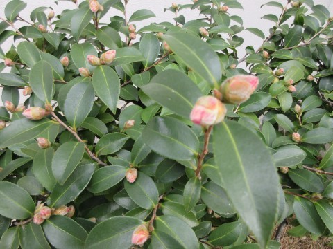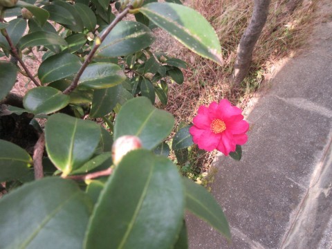 校庭の椿がたくさんつぼみをつけていました🌸よく見ると下のほうに一輪咲いている花が🌸
