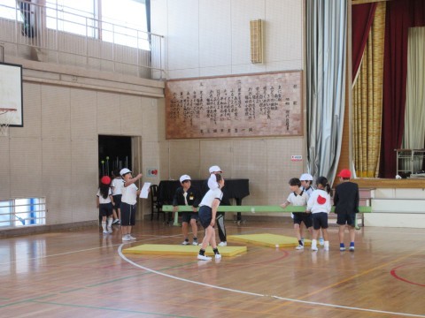 1組は体育。体育館でマットや平均台をみんなで協力して出して準備をしています。なにやら「設計図」をもとに配置するそうで💖楽しそうです💕