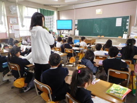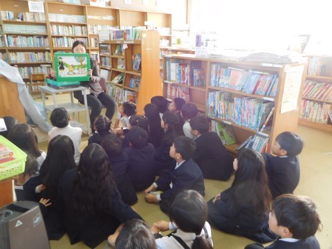 2組は図書です。みんな真剣に図書の先生の読み聞かせを聞いていましたよ。