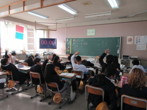 3組は算数。「分数の大きさ比べ」です。「3年生の時に習ったものとどこが違うかな?どうやって比べるかな?」すぐに答えを出して,たくさんの児童の手が上がりました✋