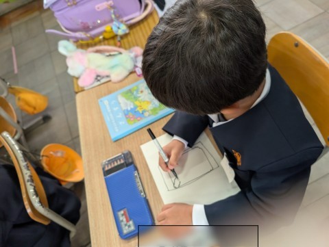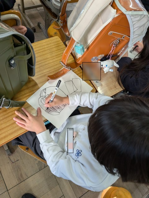 学校でお世話になっているものを描きました。ランドセルや,筆箱など,自分でお世話になったなと思うものを選び,描いていきました。はとぶえの1回目に比べて,自信をもって大きく,そして1本1本の線にも気をつかいながら描いている姿をみて,絵からもとても成長したなと感じました。立体に見せる工夫もされていて,どの作品も立派でした。また,はとぶえを描く機会があれば,さらに素敵な作品に出会えるんだなと,ワクワクします。