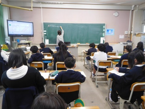 3組は算数です。四角形と三角形の面積の求め方について復習しています。